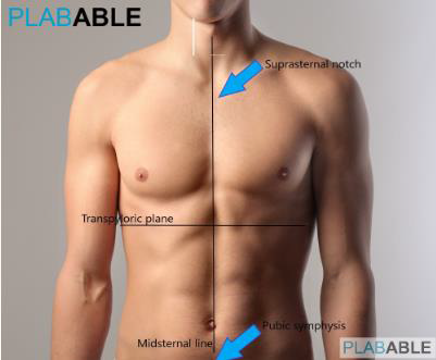 Q.57. Midpoint between the suprasternal notch and pubic symphysis. What is the most appropriate landmark?