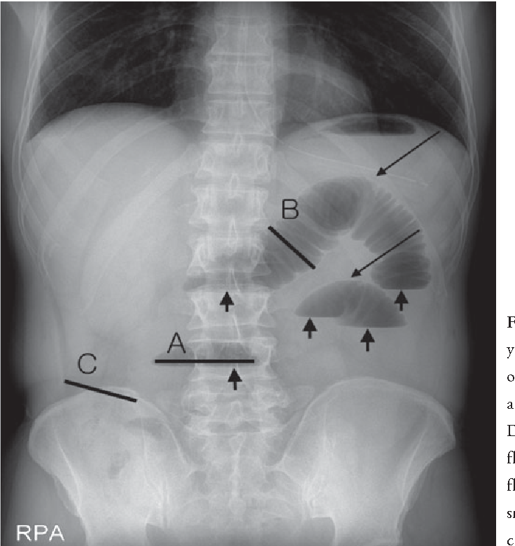 - Dialated bowel loops on X-ray especially in the transverse colon, indicates possible bowel obstruction due to inflammation.