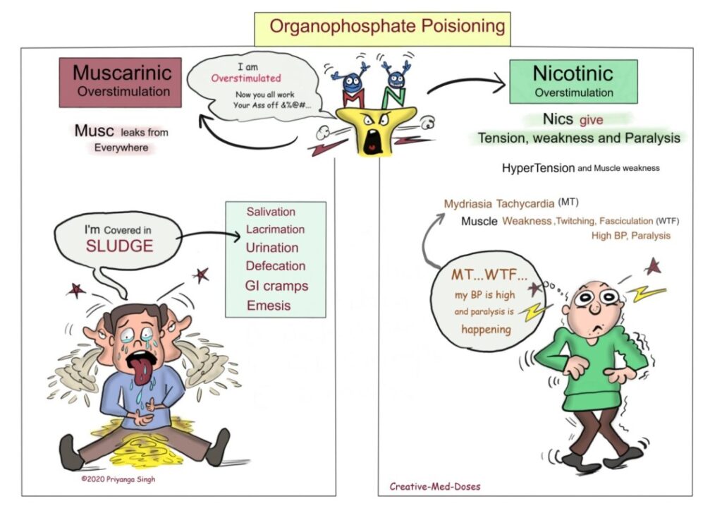 OPC causes inhibition of acetylcholinesterase leading to the accumulation of acetylcholine in the body which cause -Salivation, lacrimation, urination, defecation, gastrointestinal motility, emesis, and miosis.