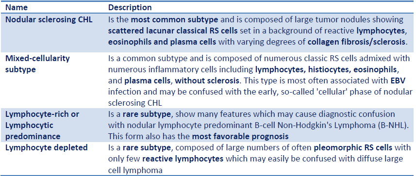 Classical Hodgkin's lymphoma can be subclassified into 4 Pathologic subtypes based upon Reed-Sternberg cell morphology and the composition of the reactive cell infiltrate seen in the lymph node biopsy specimen “the cell composition around the Reed-Sternberg cells”.